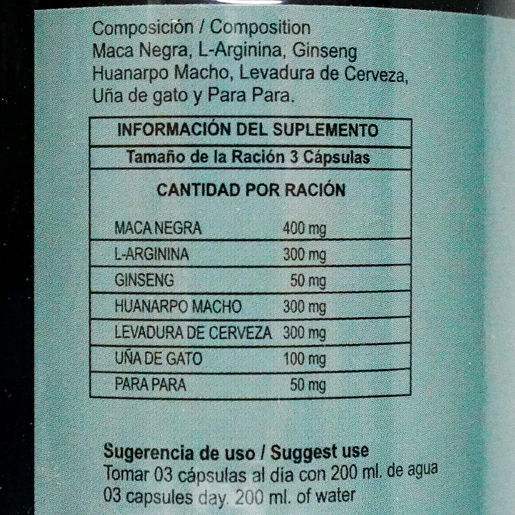 Ingredientes: maca negra, L-Arginina, ginseng, huanarpo macho, levadura de cerveza, uña de gato y Para Para.